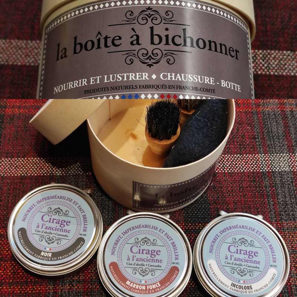 Cirages noir, marron foncé et incolore + 2 brosses à cirage cuve + chiffonnette.