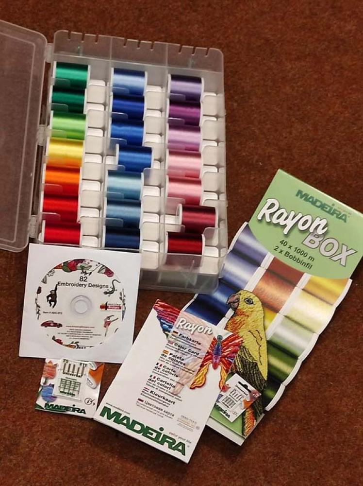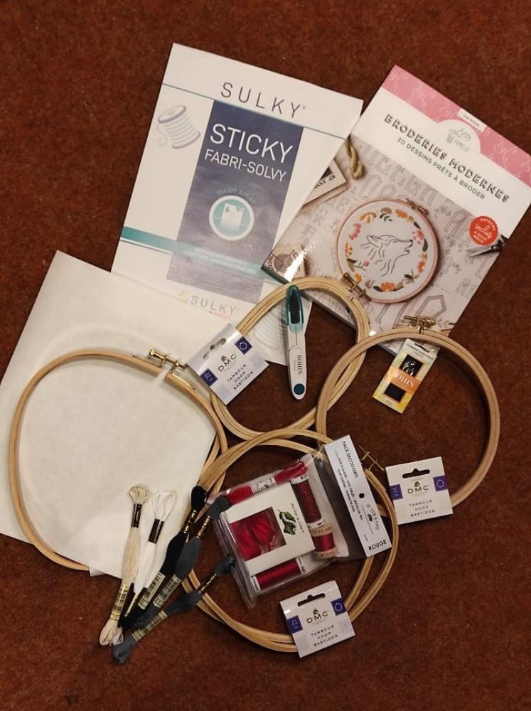 Tambours à broder, motifs, fils, aiguilles, etc.